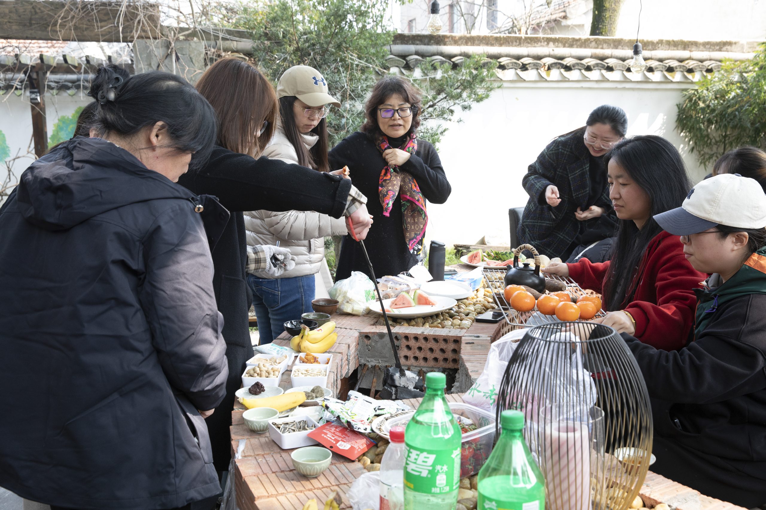 ? ? ? ?午餐后,大家在溫暖的陽光下,圍爐煮茶閑話生活。一爐炭火,一張烤架,一壺熱茶,聞茶香,且喜人間好時節(jié),在爐臺上,大家煮著茶,圍在爐子旁,煮茶、烤紅薯、香蕉、桔子、板栗、花生…..圍一方天地,生一爐煙火,在圍爐煮茶,享受著春天絲絲暖意,別有一番情調。靜謐、淡然、怡情,一起細細地品味春天的味道!