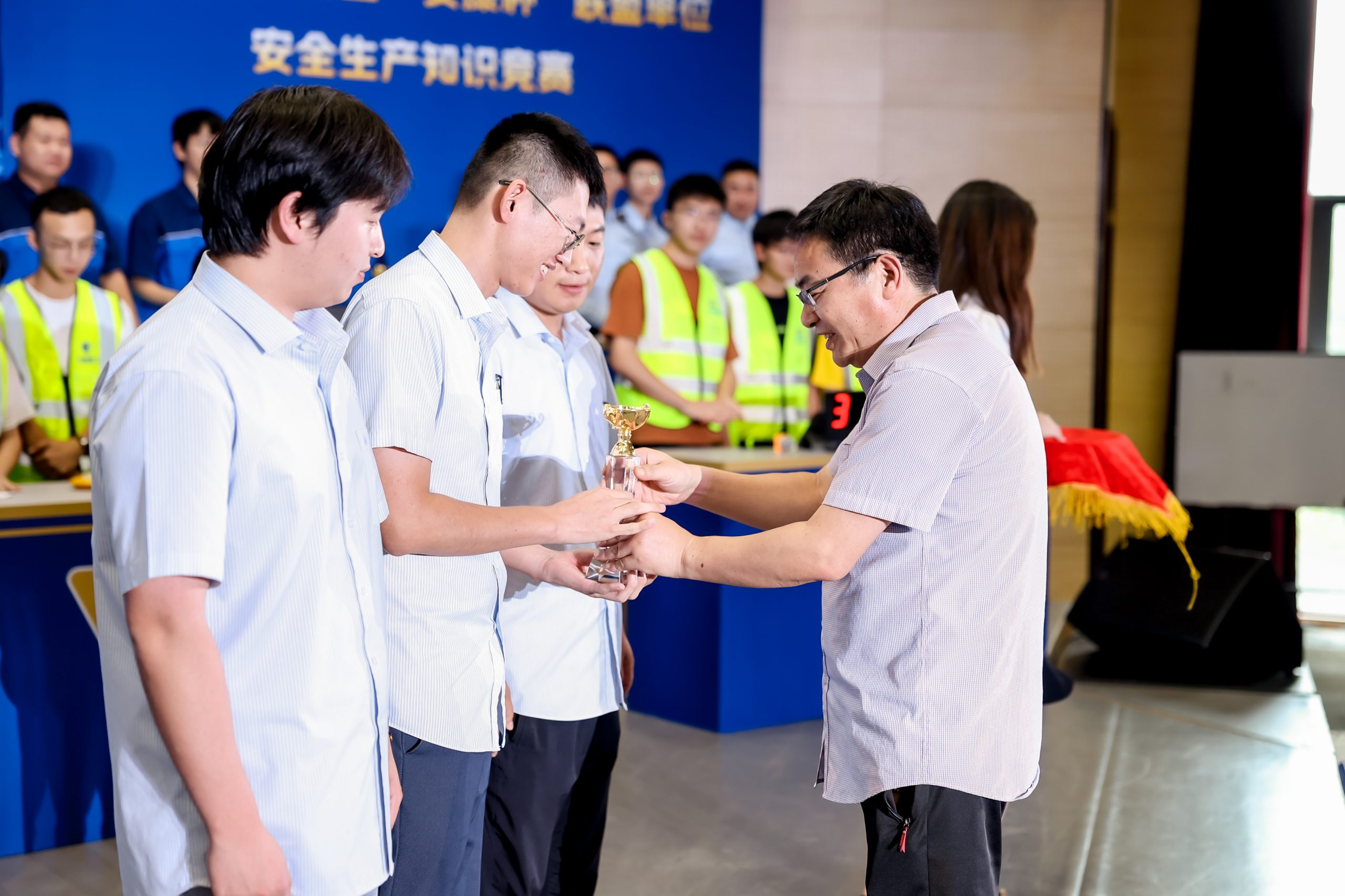 ? ? ? 經(jīng)過三輪的激烈角逐,最終由葉經(jīng)店、李盛、程文博三位隊(duì)員組成的寧波建設(shè)集團(tuán)代表隊(duì)脫穎而出,斬獲一等獎(jiǎng)。寧冶勘、中交水利、寧波建工工程集團(tuán)榮獲二等獎(jiǎng),住宅集團(tuán)、寧波市政集團(tuán)、中交三航、產(chǎn)城集團(tuán)獲三等獎(jiǎng)。寧波市海員建設(shè)工會(huì)主席楊真照為獲獎(jiǎng)選手頒獎(jiǎng)。