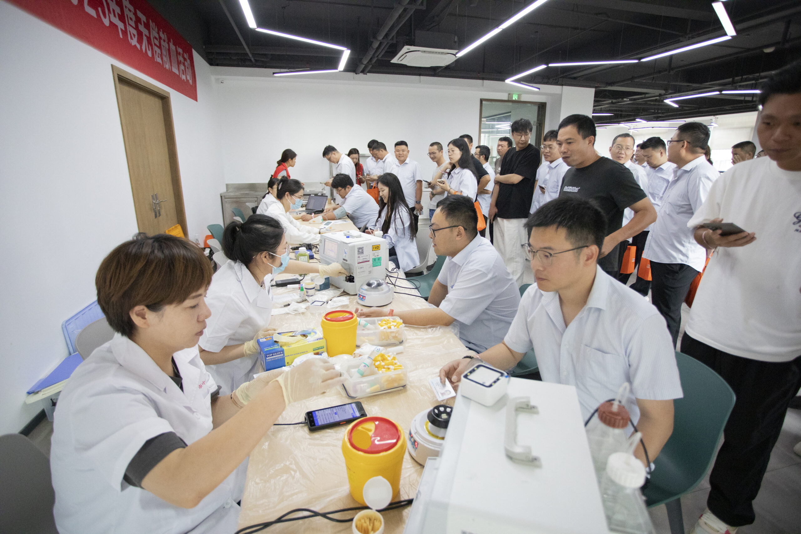 ? ? ? ?上午七點(diǎn)半,報(bào)名獻(xiàn)血的職工陸續(xù)來到現(xiàn)場登記,前往3樓食堂井然有序地排隊(duì)做獻(xiàn)血前的檢驗(yàn),現(xiàn)場氣氛熱烈而有序,獻(xiàn)血職工工作人員的指引下,有條不紊地進(jìn)行登記、檢驗(yàn) 、采血等流程。